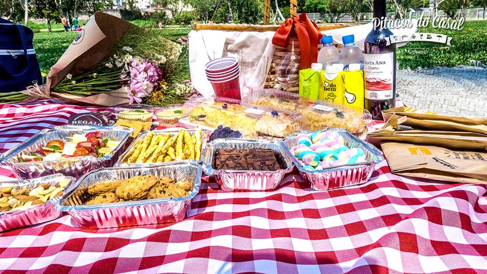 A cesta clássica de piquenique pode ser personalizada. A nossa veio super recheada com: palitinhos de queijo parmessão, creme de queijo com curry, patê de atum defumado, mix de nuts, espetinhos de frutas com melão, morango e uva, marshmallows para lembrar o gostinho da infância, mini broniews, cookies de baunilha com gotas de chocolate, nutella, alfajores, sanduíche de presunto, rúcula e abacaxi e sanduíche de queijo com tomate, vinho, taças, copos, kits com talheres e guardanapos para cada um, suco de laranja, limonada, água.