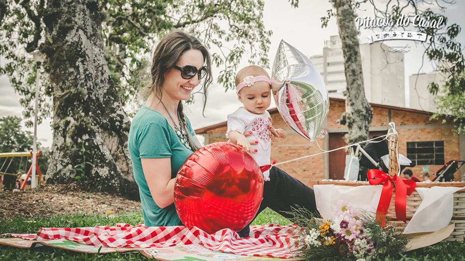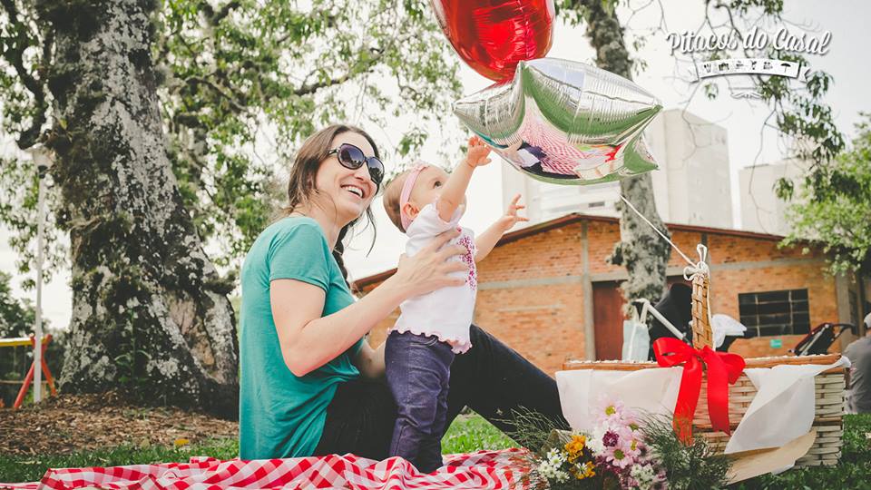 Nosso piquenique foi completo, com a toalha xadrez, flores para embelezar nosso passeio e balões para a Dorinha brincar!