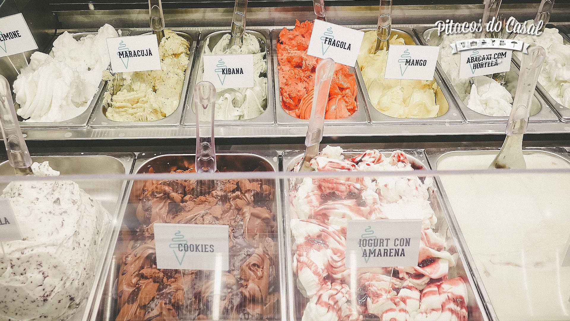 São opções de gelatos de frutas e cremosos: morango, limão, manga, kiwi com banana, nata, mascarpone, gengibre, chocolate com avelã, cookies, iogurte, dentre outros, e tudo com ingredientes frescos.