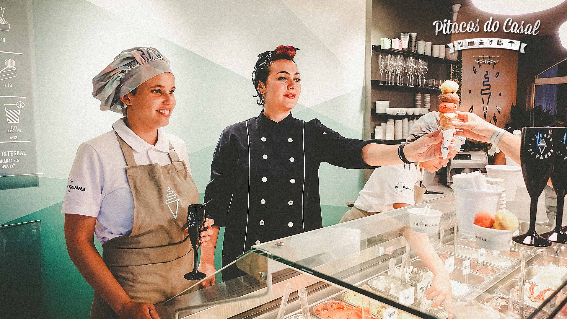 Os gelatos são servidos no copinho, casquinha, em estilo menu degustação com cinco sabores, e até em drink com espumante. Pensa num espumante com uma bola de gelato… muito refrescante e saboroso!