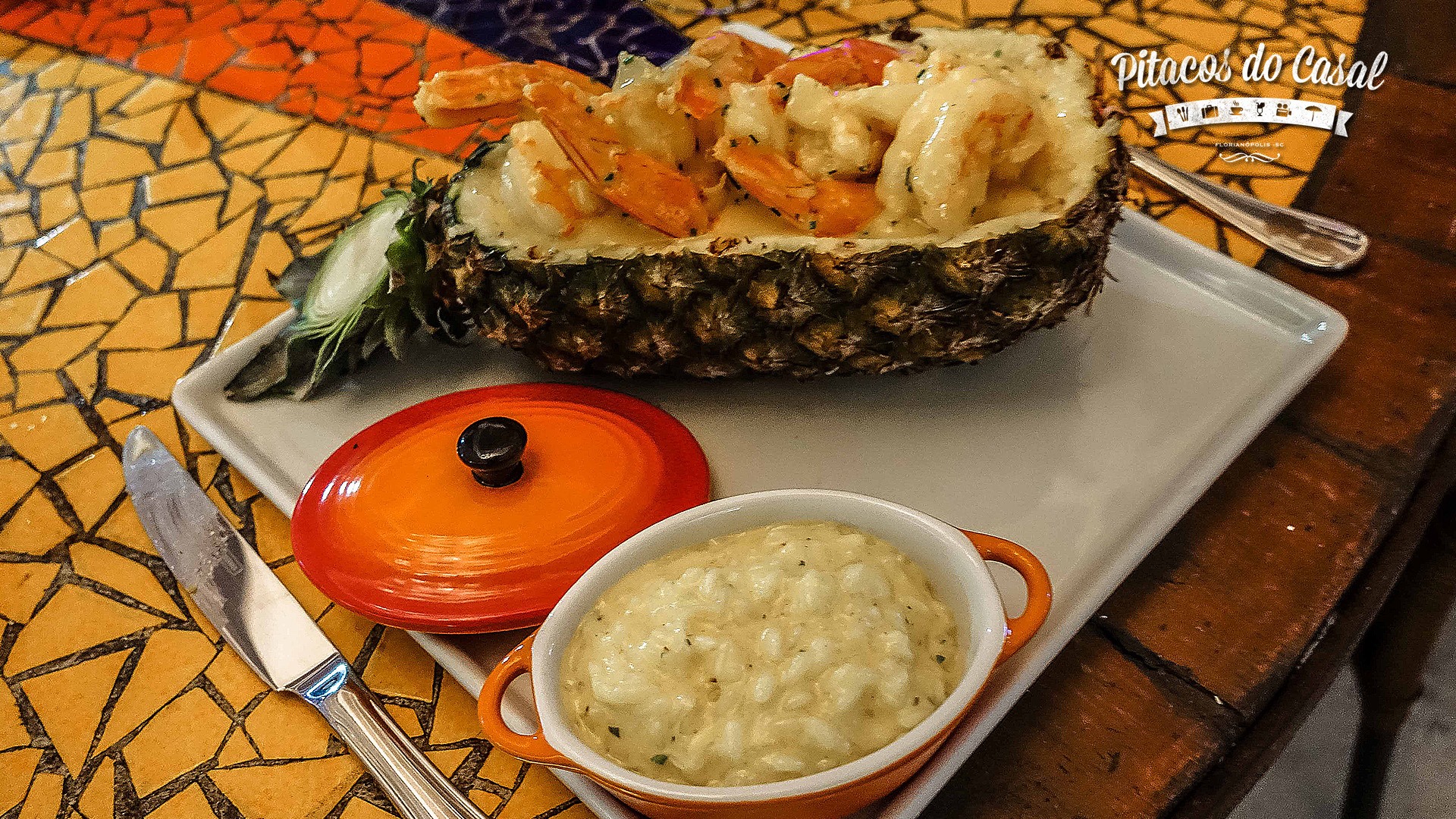 Como prato principal escolhemos a Lagosta Imperial e o Camarão à Valenciana. A lagosta já é imponente desde o nome não é?! Servida com molho de laranja e risoto de trufas que particularmente adorei!! O camarão não ficou para trás, um prato lindo, com camarões servidos num abacaxi e servido com risoto de alho poró, delícia! O camarão foi nosso preferido, mas o risoto foi o de trufas.