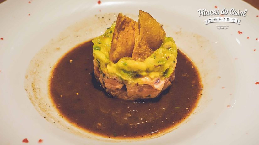 Para entrada, pode-se escolher ceviche ou tartar de salmão ou atum. Escolhemos o tartar de salmão, que vem coberto de abacate, nachos e molho ponzu. Adoramos! Fica o pitaco mesmo quem não vai de “Menu Experience”.