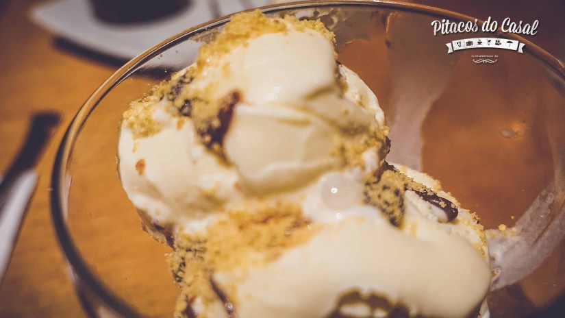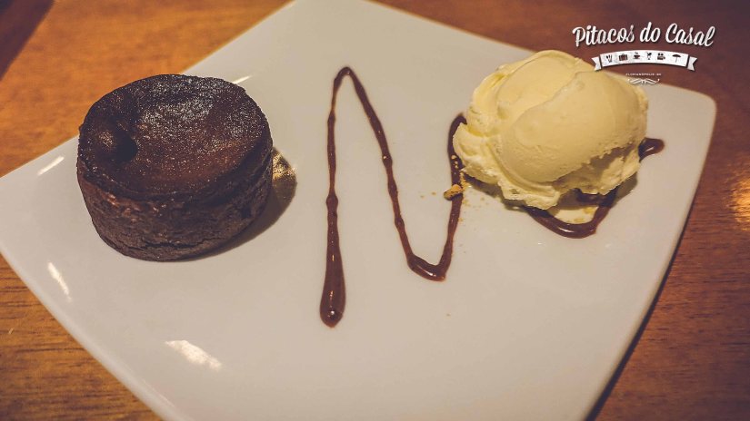 Como sobremesa, ainda parte do Menu Experience, o cliente escolhe entre dupla de Banana Caramelizada ou uma Bola de sorvete com calda de brigadeiro e farofa crocante. Provamos o sorvete, com a calda deliciosa, e o Marcos não poderia passar sem o Petit Gateau de Chocolate, para finalizar com sua essencial cota de chocolate!