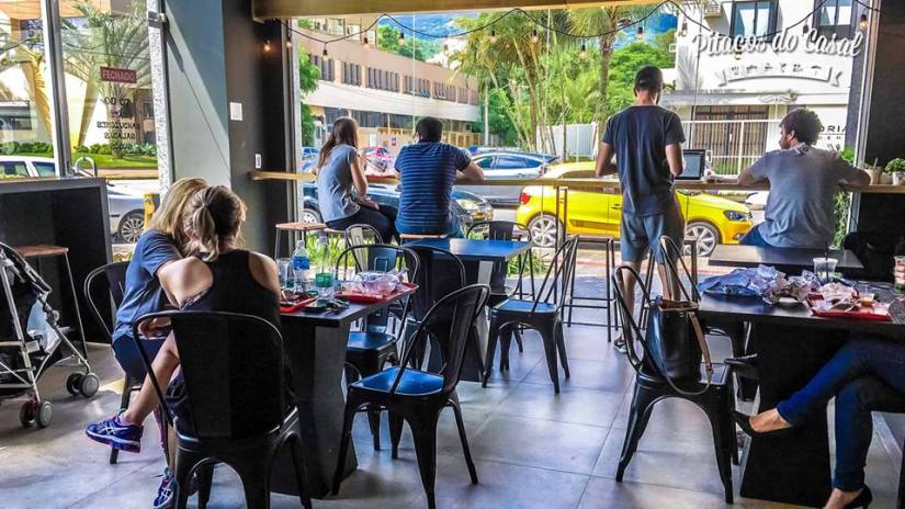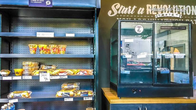 O modelo é de autosserviço, os lanches ficam expostos em prateleiras, o cliente escolhe o que vai consumir e passa no caixa.