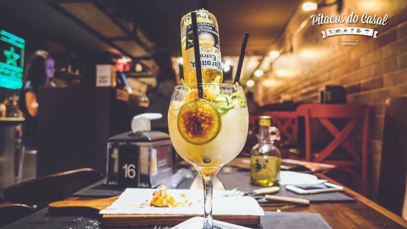 Por fim a Coronarita, inspirada também nos Estados Unidos, naqueles drinks enormes para várias pessoas. Mas esse é um pouco menor, para até duas pessoas, leva cointreau, suco de limão e tequila, uma garrafa de corona e finalizado com caramelo de limão. Gostamos bastante, só não é recomendado para quem está de estômago vazio rsrsrs.