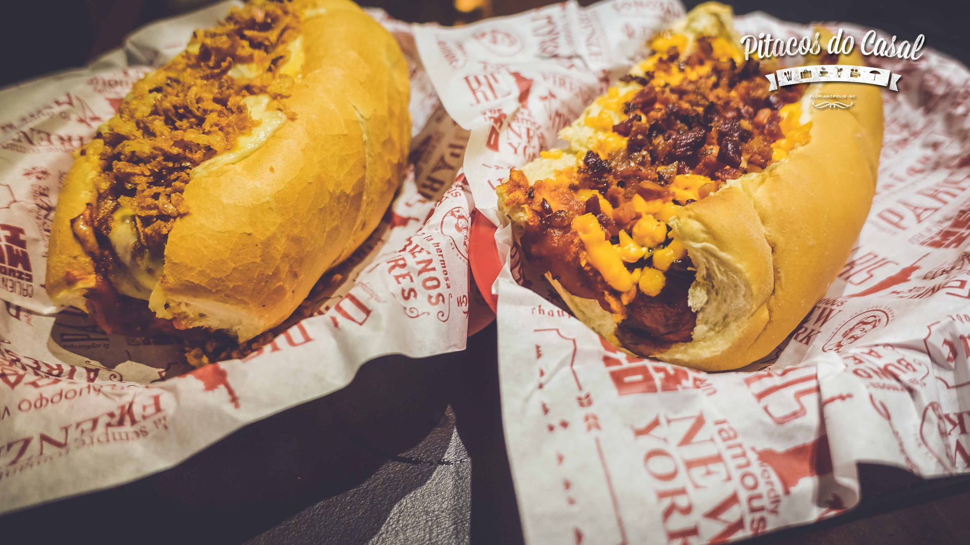 O New York é servido no pão Burton, com molho secreto, molho barbecue, salsicha Viena, cebola caramelizada, molho barbecue com curry, queijo cheddar e bacon crocante. Super aprovado pelo casal, foi o preferido do Marcos.