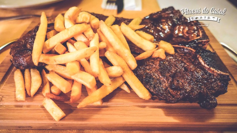 O prato principal é T-bone, Prime Rib ou Entrecot, servido com batatas fritas à vontade. Quando fomos, a opção do dia era o T-bone, servido para duas pessoas, com batatas fritas por cima. A carne é de novilho precoce, bem macia, e as batatas fritas bem gostosas e sequinhas.