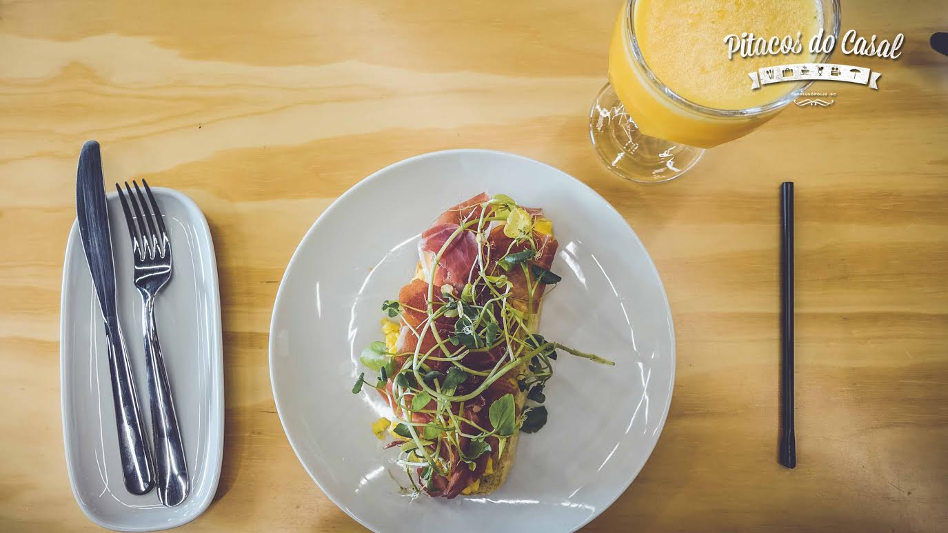 Para o prato principal as opções eram Tostada de pão artesanal com salmão selvagem do Alasca, avocado e creme azedo ou Tostada de pão artesanal com presunto cru, ovo mexido e agrião.