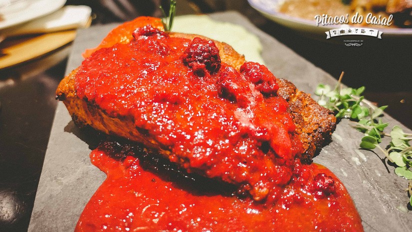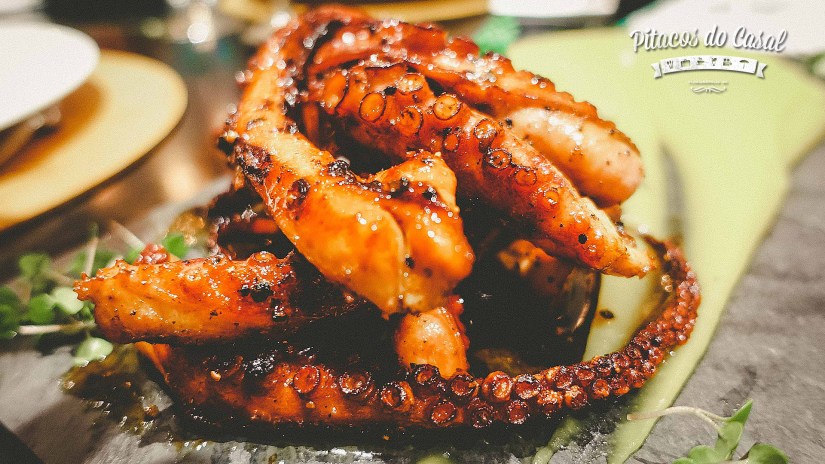 O Polvo e o Salmão são indicados para duas pessoas, servidos em uma tábua com seus acompanhamentos. O salmão, com crosta de castanha do pará, estava bem suculento, servido com creme de aspargos e calda de amora. Os tentáculos do polvo são servidos grelhados, num ponto bem macio, bem temperado, acompanhado de purê de batata baroa com infusão de tucupi, azeite, manjericão, tomilho, mel e suco de laranja.