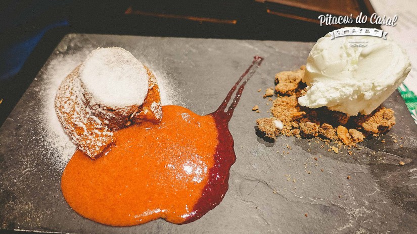 Confesso que de todos o petit gateau de goiabada foi o que menos me chamou a atenção de cara, mas me enganei, bolinho fofinho de goiabada, quentinho, com o recheio escorrendo, servido com sorvete de mascarpone e calda de frutas vermelhas… hummmm.