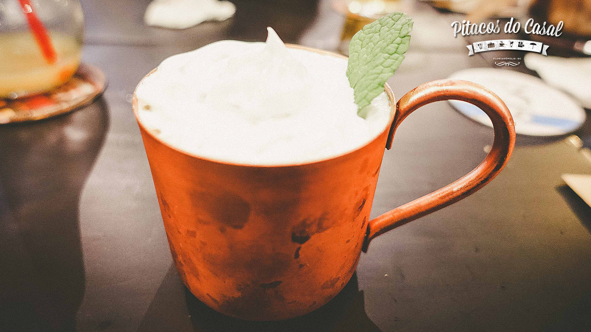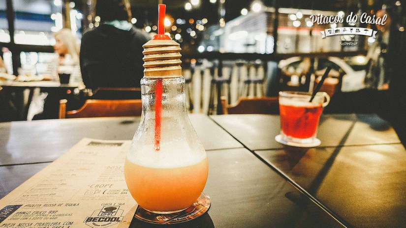 Na parte de drinks, há opções clássicas como Moscow Mule, Mojito, Caipirinha, Gin Tônica e Cosmopolitan, e drinks autorais como o Hibiscus e o O Iluminado. Tem, também, o resgate de um clássico não tão popular por aqui: o New York Sour, drink com whisky e vinho. Sobre os clássicos que provamos, consideramos todos bem executados, gostosos, sem querer inventar onde não se deve mexer. Já sobre os drinks autorais, achamos os dois interessantes. O Hibiscus, com chá de hibisco, vodka, mel, suco de laranja e aperol é leve, refrescante, bem doce. O O Iluminado, com purê de damasco, cachaça, suco de laranja e gotas de pimenta é mais forte, deixa aquele ardor da pimenta no final, e é o mais divertido, servido em um frasco em formato de lâmpada.