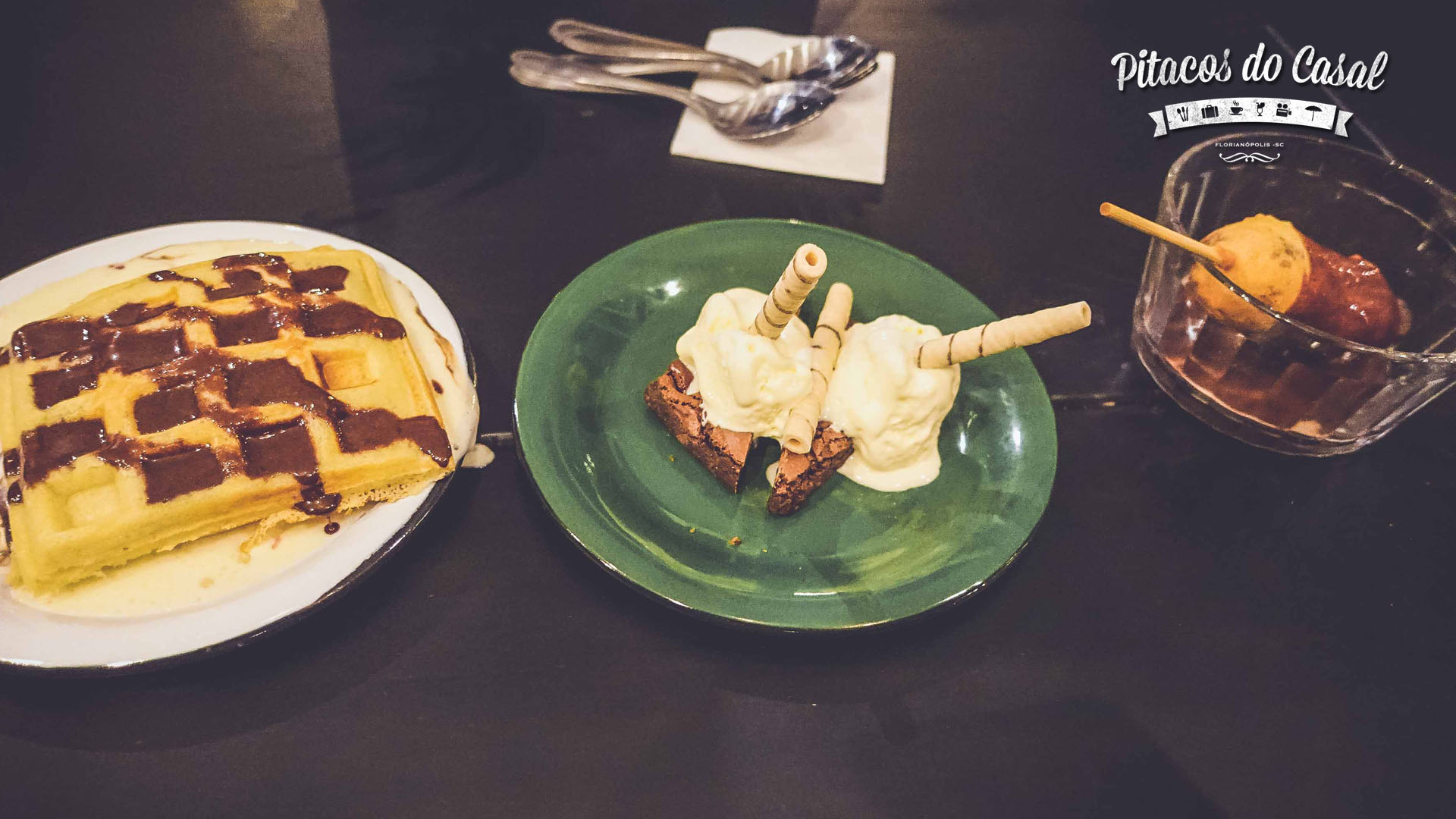 E para a vontade de doces, tem sobremesas no cardápio também: Alegria no Palito (chocolate Snickers empanado na massa de bolinho de chuva frito e calda de Nutella), American Way (sanduíche de waffle com recheio de sorvete Amoratto, galeia de amora e calda de Nutella) e Yin Yang (brownie de Nutella da Browneria com sorvete de creme Amoratto e Tubette). A Alegria no Palito achei muuuuito doce (o que pode ser uma boa qualidade, dependendo da formiguice, né?), e o American Way achei muito massudo para uma sobremesa, mas comeria amarradona como café da manhã ou lanche! Hahahaha Para os chocólatras de plantão (como nós), o Yin Yang acerta em cheio: brownie com sorvete, adoramos!