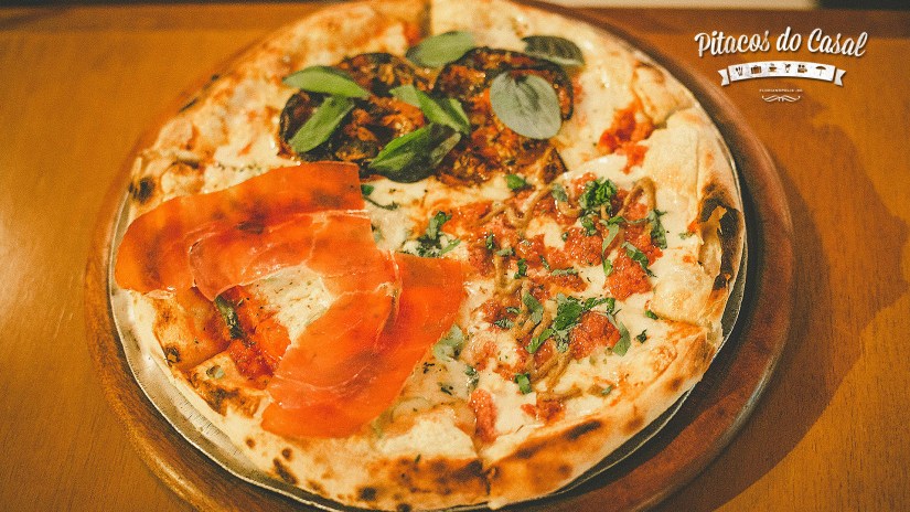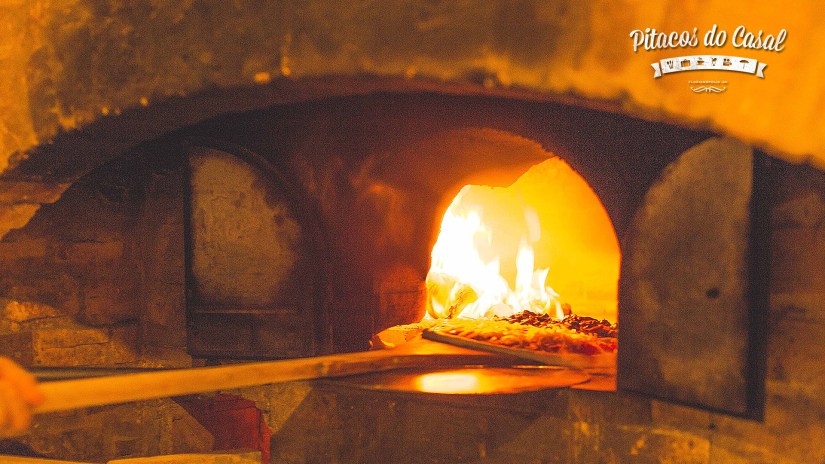 Ah, faltou mencionar que a pizza é assada em forno à lenha, o que garante um leve defumado.