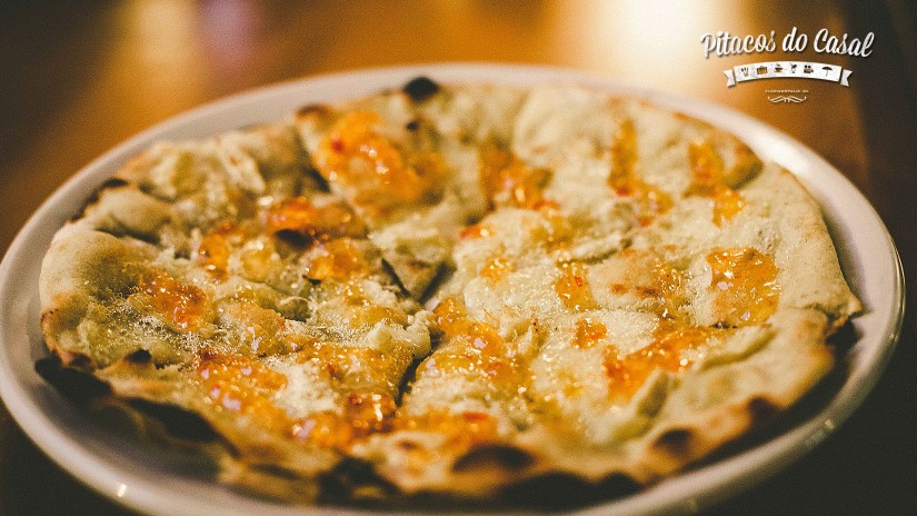 Da parte dos aperitivos, provamos o Corniccione Sweet-Pimenta e o Pick-Nick de calabresa. O corniccione é a massa aberta fininha de pizza, e o Sweet-Pimenta é com queijo Brie francês e geleia de pimenta. O Pick-Nick é um rolinho de massa fininha, gratinado com parmesão, e o nosso veio recheado com calabresa moída, muçarela e alecrim. O corniccione me surpreendeu, poderia comer aquilo o resto da noite! E fica o registro que a geleia de pimenta tem gosto de pimenta. Não é excessivamente picante, mas também não é só o doce da geleia, como normalmente encontramos em outros restaurantes já visitados.