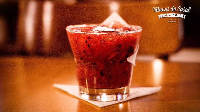 Começamos nossa experiência por um drink próprio, o Sparkling Açaí, com gin, licor de açaí, água tônica e flor de hibisco – leve, mas com o gosto característico do gin. Depois fomos na indicação da garçonete que nos atendeu, e provamos a Caipirinha de Frutas Vermelhas, que estava muito boa, bem saborosa e docinha.