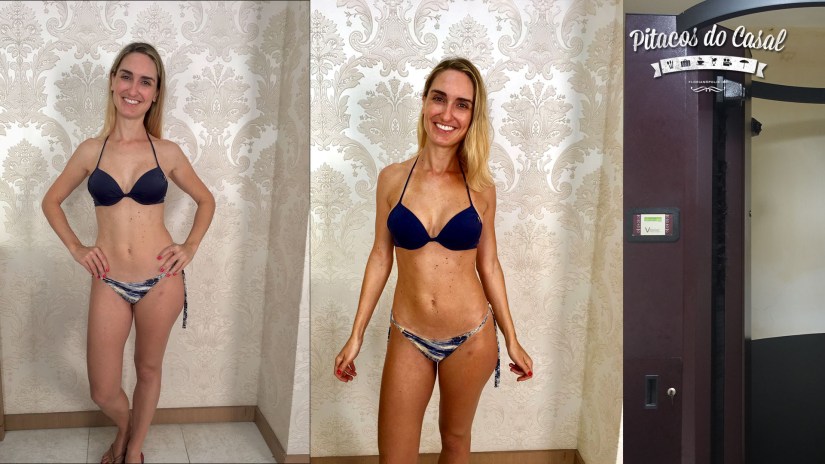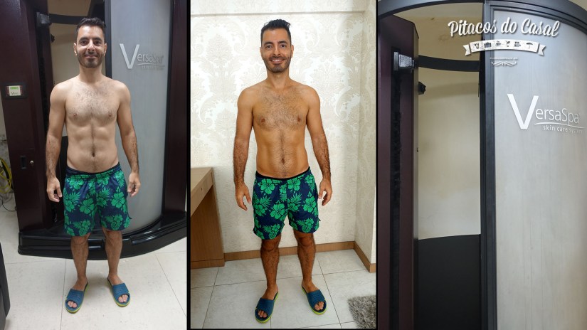 Então é só entrar na cabine e esperar o jato de tinta, que é aplicado no corpo todo, e quem está ali dentro só tem que fazer algumas posições, para uma aplicação mais parelha. Super rápido, em menos de 5 minutos saímos super bronzeados!