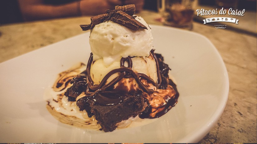 Partindo para a sobremesa, o Hazelnut Thunder From Down Under é um brownie de chocolate recheado de creme de avelã, servido com uma bola de sorvete, chantilly, calda e raspas de chocolate. Só de ler os ingredientes já dá para ver que não tem como ser ruim! Rsrs E realmente, nós que somos fãs de creme de chocolate com avelã adoramos! É uma sobremesa bem grandinha, na nossa opinião serve para dividir entre 2 ou 3 pessoas (depende do que vocês comeram antes e da fome).