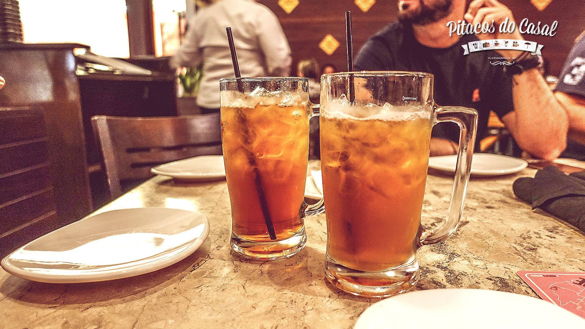 Nossa visita foi bem comportada, à base de bebidas não alcoólicas: chá gelado e suco natural. Os iced teas são servidos na caneca cheia de gelo, bem refrescante, e o refil é grátis. Pedimos com sabor de cranberry e de pêssego. Gostamos dos dois, mas o meu preferido foi o de cranberry, mais docinho. Para quem gosta de suco natural, a mistura do Laramora é bem interessante: morango com suco de laranja, sabor docinho, com apresentação dos sucos separados, e a gente vai misturando à medida que consome.