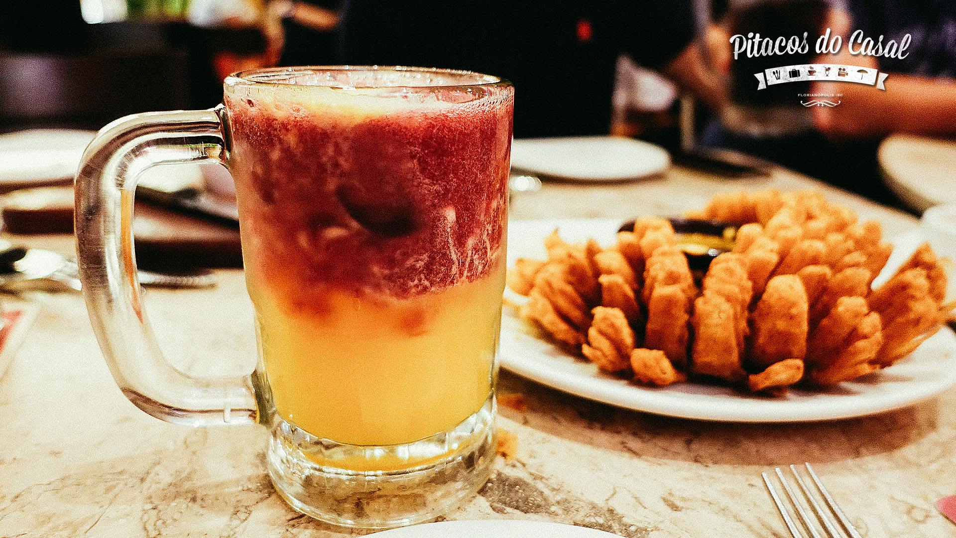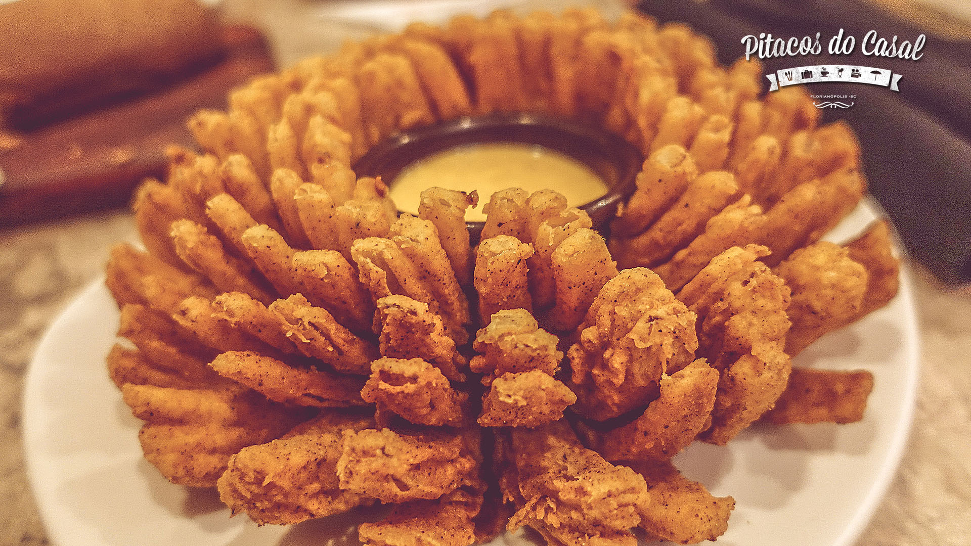 Na nossa visita, provamos também a Bloomin’ Onion, a cebola tradicional do Outback, que fica molhinha na parte da cebola, com a casquinha bem sequinha. Pedimos com o molho picante, bem saboroso e que não é ardido. Mas nós adoramos molhos picantes, então atenção, se você não gosta, talvez seja melhor pedir com molho suave.