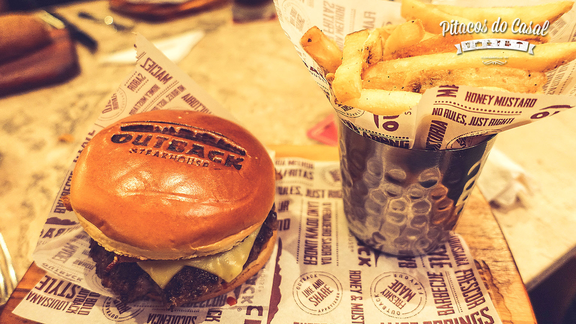 O Bloomin’ Picanha Burger é com hambúrguer de picanha (240g), servido em pão brioche, com queijo emmenthal, smoked mayo, molho Flame, bacon e pétalas da cebola Bloomin’ Onion. Olha quanta coisa boa nesse recheio minha gente! É realmente muito bom, com a carne grelhada ao ponto, vermelhinha por dentro, super suculenta. A cebola do Outback já é uma delícia, colocá-la dentro do burger trouxe um gostinho ainda mais especial. E ainda tem o charme da logomarca prensada no pão!