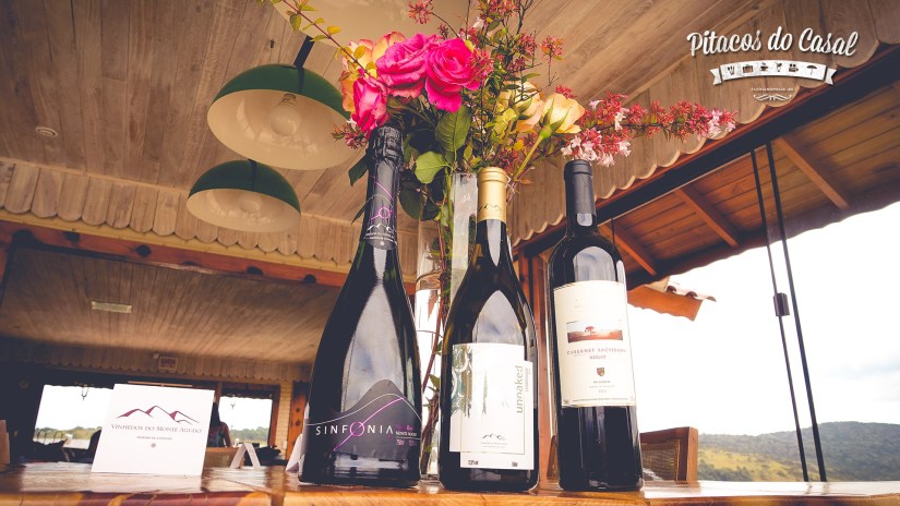 Chegando ao restaurante, localizado no topo da propriedade, já fomos recepcionados com o espumante rosé Sinfonia. A vista lá é incrível, estamos cercados por parreiras, macieiras e muita natureza.