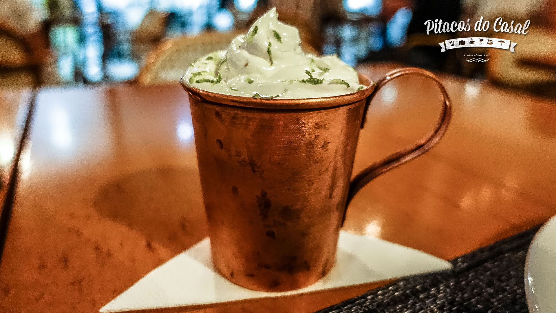 Um vinho tinto cai muito bem com a Margherita Italiana, mas optei por provar o Moscow Mule da casa. É uma bebida que ficou bem popular em Floripa no último ano, mas há algum tempo eu não provava um que gostasse tanto. Leva vodka, suco de limão, xarope de gengibre, chopp e espuma de limão.