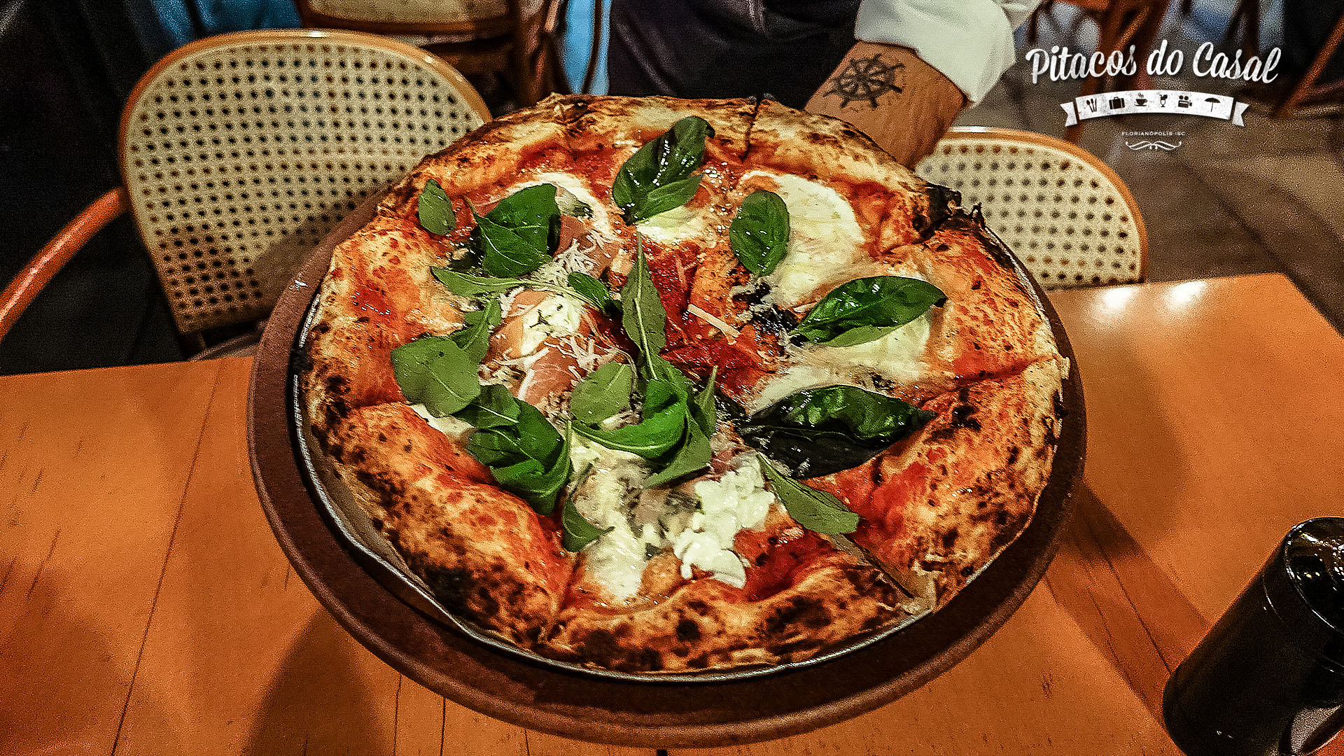 Como também somos chegados a uma carninha nas nossas redondas, aproveitamos a visita e pedimos metade do sabor Italianíssima, que vem com molho de tomate, mozzarella de búfula, pesto de manjericão, pecorino romano, presunto tipo Parma e mini rúcula. Difícil eleger a melhor!