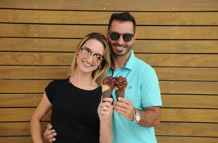 O Marcos é apaixonado por todos os sabores que levam chocolate, mas eu confesso que não era meu preferido, até chegar o sabor Pitacos do Casal, que é muito cremoso e gostoso. O morango misturado ao chocolate dá um sabor especial que deixa o gelato delicioso.