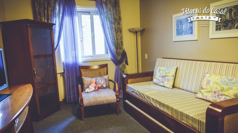 Ficamos no Apartamento Suíte Especial com Banheira. O apartamento tem quarto de dormir, sala de TV, mini copa e banheiro. Ficar em um lugar assim amplo, com criança, é de fato muito bom, pois não precisamos ficar todos amontoados, e a criança tem espaço para se movimentar no apartamento.
