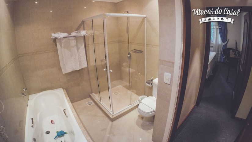 Nosso banheiro tinha chuveiro vertical e banheira de imersão individual (coisa boa para relaxar no fim do dia de passeios!), secador de cabelos, e os produtos de banho disponíveis eram da O Boticário, o que achei muito legal, pois normalmente são de marca genérica de não tão boa qualidade.