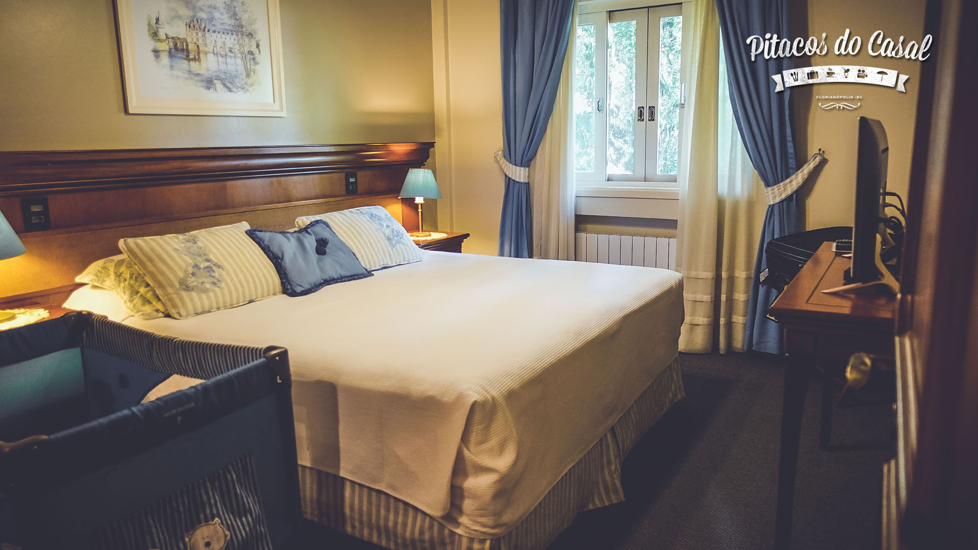 A cama do quarto em que ficamos era enorme, tamanho king, e muito confortável. O quarto de dormir é ocupado com televisão, cofre, ar condicionado, e ainda deixaram prontinho um berço para a Dora (já tínhamos avisado na reserva).