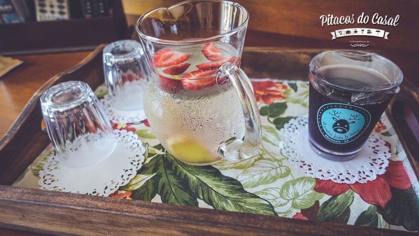 Fomos recepcionados com uma bandeja com água saborizada, suco para a Dora e chocolatinhos da região, um mimo desejando nossa boa estada!