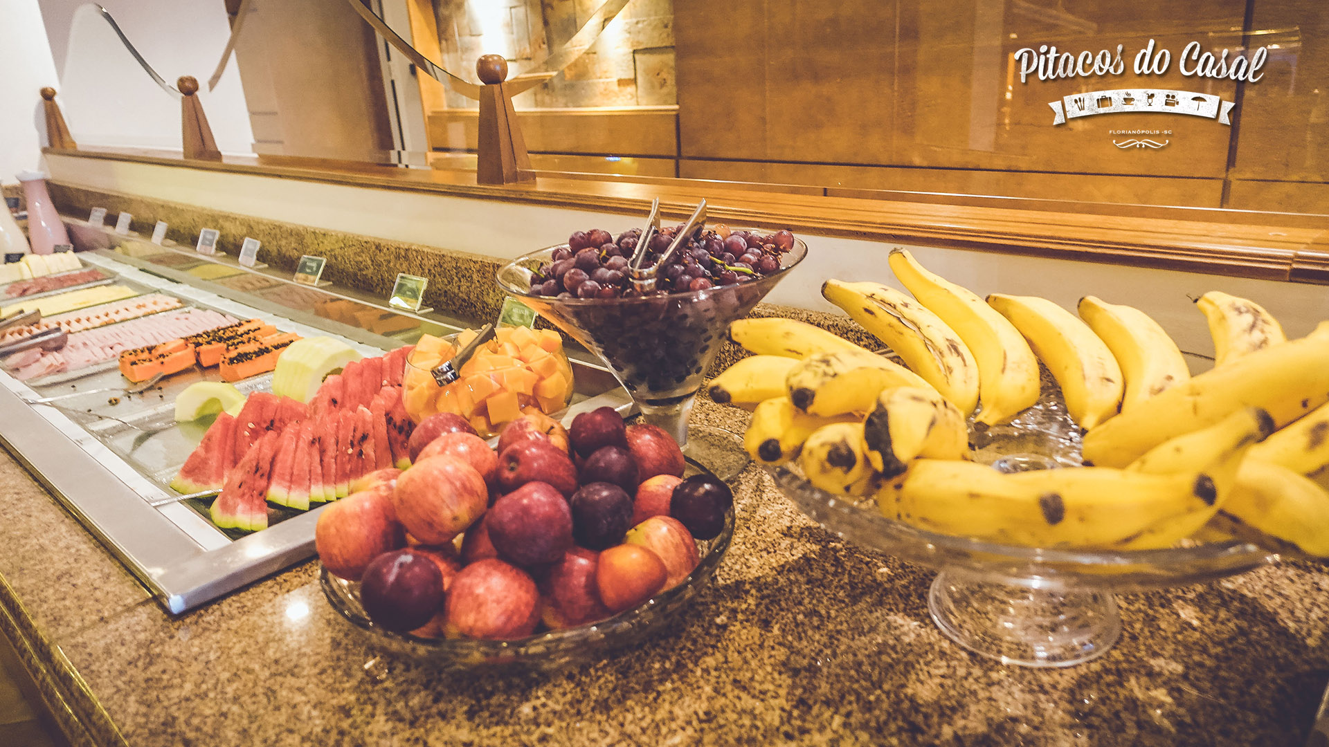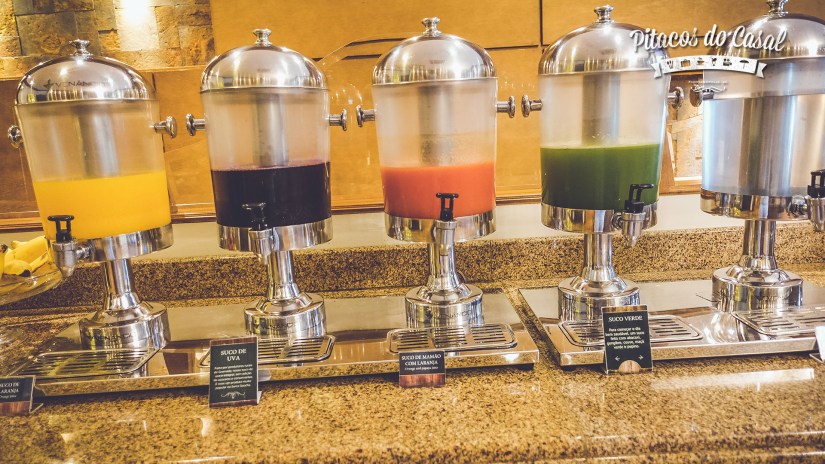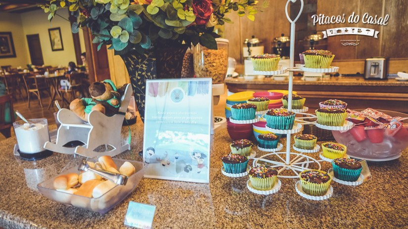 O café da manhã está incluído na diária, e é um belo de um café da manhã, com diversas opções de pães, bolos, salgados, geleias, frios, iogurtes, frutas, omelete, molho de salsicha, sucos. É bem farto e uma delícia. Para as crianças, há uma mesa especial, montada com bisnaguinha, sucrilhos, cupcakes e iogurte.