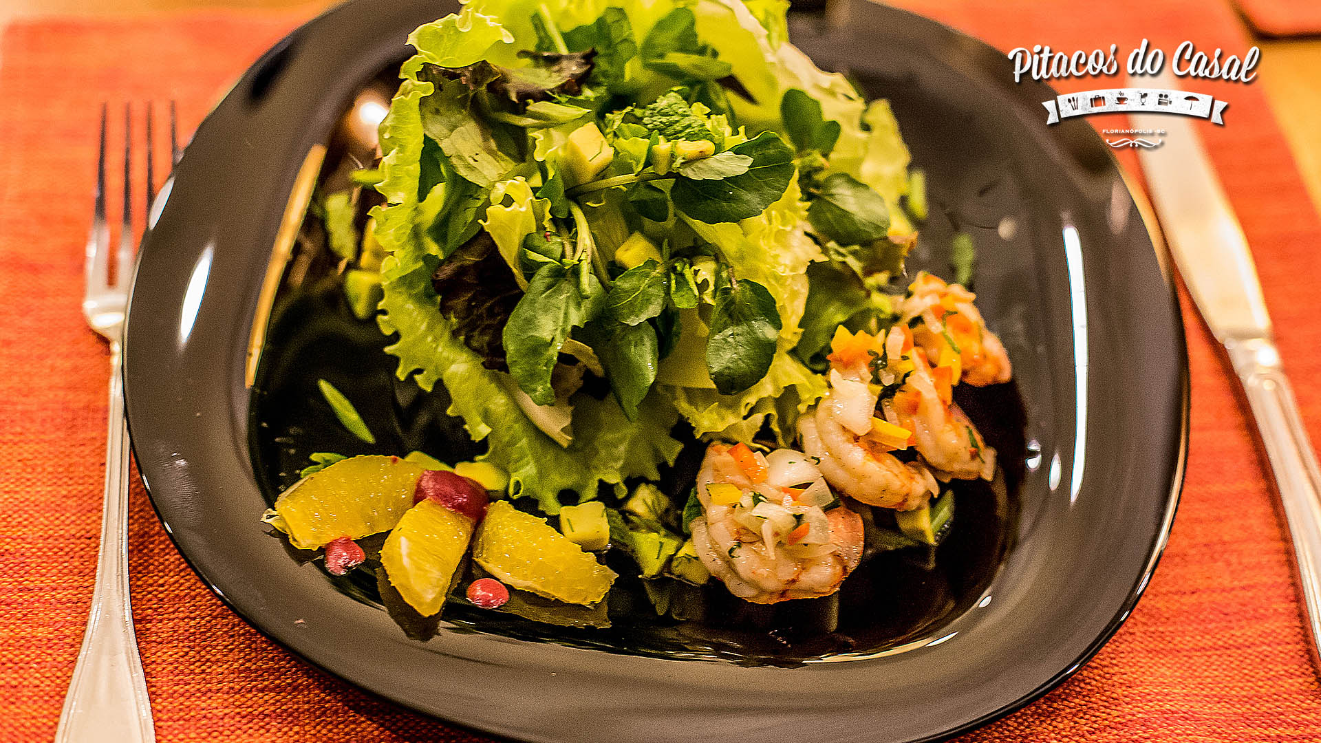 Na segunda noite, provamos alguns itens que estavam para ser incluídos no cardápio. Então fomos novamente de Sugestão do Chef. Dessa vez a entrada foi Salada Refrescante, com mix de verdes, gomos de laranja, erva-doce, marinada de camarões, abacate e hortelã. Achei essa composição bem interessante. A salada fica mesmo refrescante, os camarões vêm bem temperadinhos, os sabores são bem marcantes.