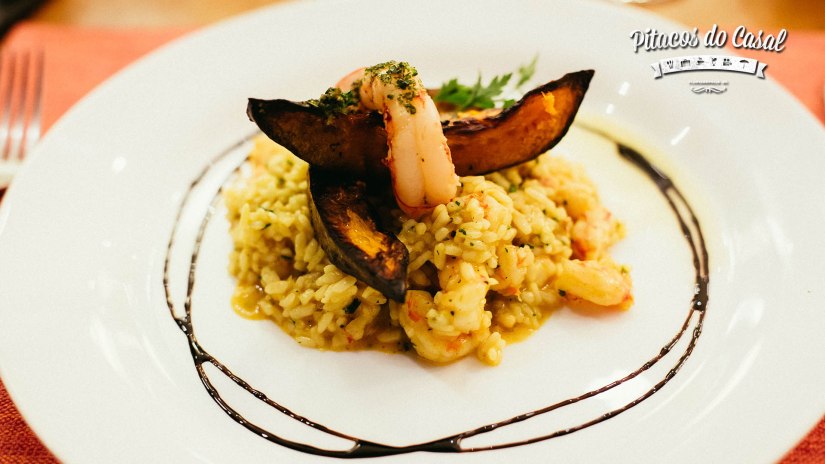 O prato principal do Marcos foi Risoto de arroz arbóreo com camarões, abóbora assada, pistilos de açafrão e pesto de hortelã. O arroz estava cozido no ponto certo e a abóbora foi uma boa surpresa, trazendo um ponto doce ao prato.