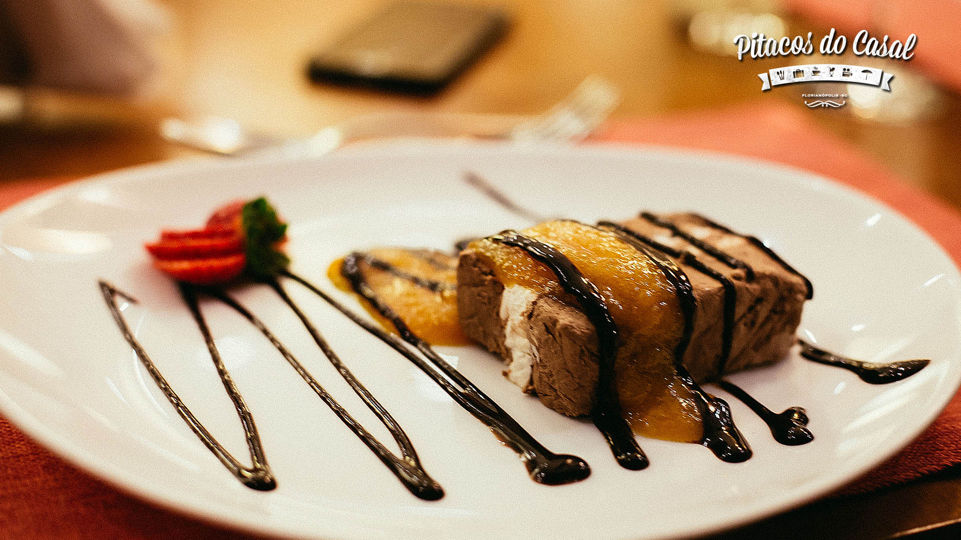 Meu prato principal foi Salmão grelhado ao leito de purê de banana da terra, frappé de vinho e tomates cereja com amêndoas laminadas. Eu adoro salmão, e estava saboroso, com um bom tempero. O purê de banana é ideal para quem gosta de misturar bastante doce com salgado. Eu particularmente me identifico melhor com purê de batatas, por exemplo, mas é questão de paladar.