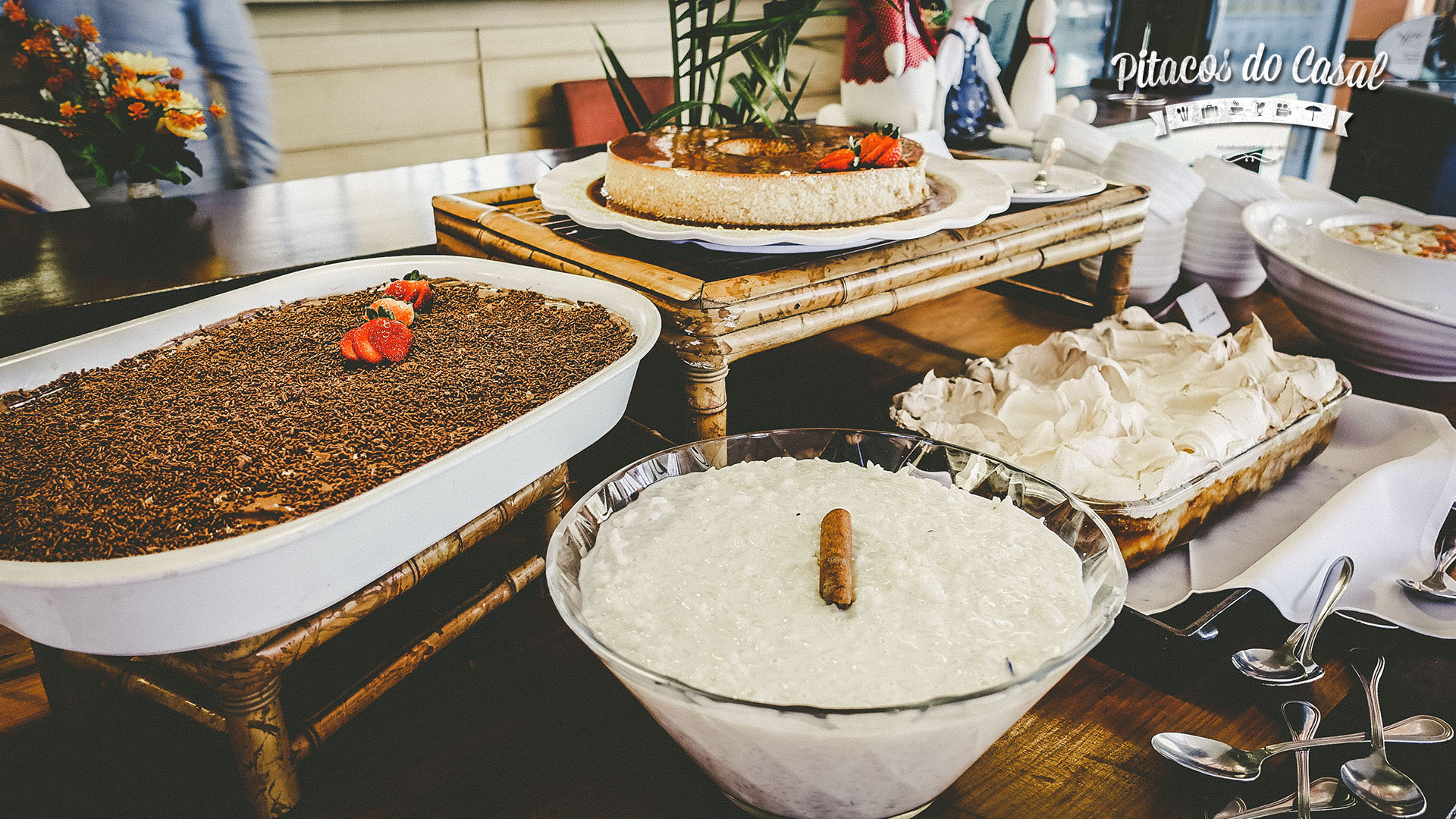 Também há um buffet de sobremesas. Nesse dia havia uma seleção de encher os olhos, com pudim de chocolate, pudim de leite, chico balanceado, salada de frutas.