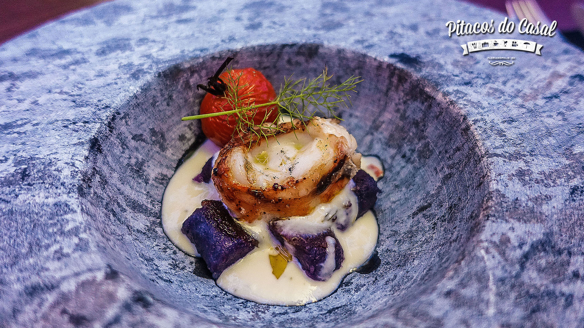 1. Lagosta na brasa, gnocchi de batata doce roxa, molho vermouth dry, tomate confit e azeite de limão siciliano. A lagosta estava perfeitamente cozida, macia sem estar borrachuda, e o tomate confitado deu um sabor maravilhoso ao prato.
