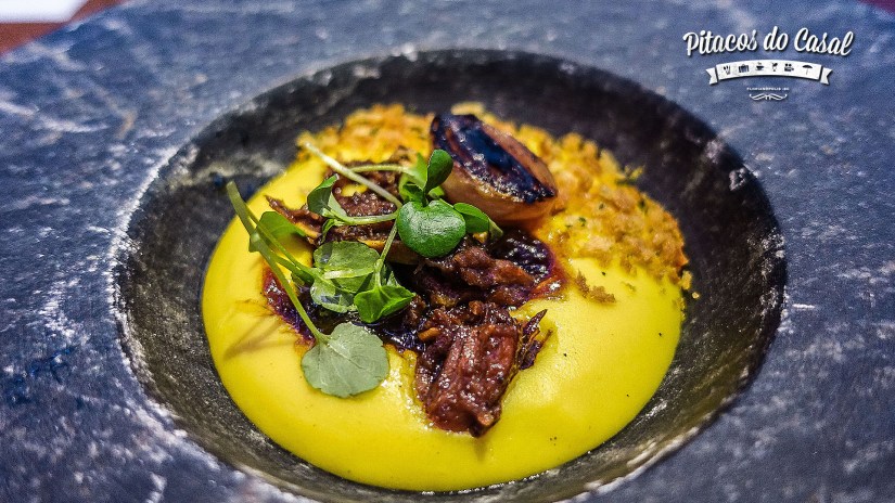A entrada foi uma Polenta cremosa com ragu de costela cozido em baixa temperatura, roti de cebola, echalote brullee, gremolata de pão italiano e azeite de trufas brancas. Um prato que praticamente nos dá um abraço ao saboreá-lo. Sério, é tão cremoso e cheio de sabores que nos faz nos sentir muito bem. Eu continuaria comendo esse prato ao natural como principal…