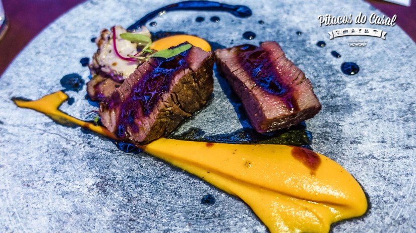 2. Mignon grelhado, molho de ostra, rapadura e roti, cogumelos grelhados, purê de cenoura com curry vermelho e echalotes tostadas. Novamente, a carne em ponto perfeito, com molhos bem diferentes e interessantes.