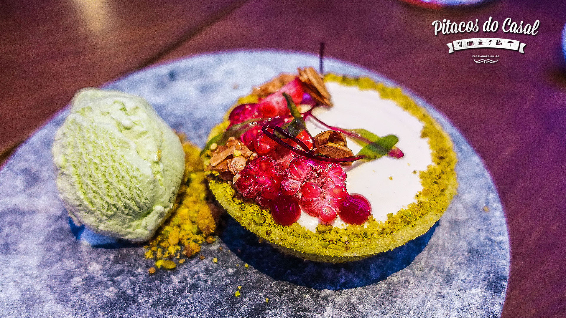 Para finalizar, foi servida uma tortinha com massa de pistache e recheio de creme limão, calda de framboesa e sorvete de pistache. Para fechar o jantar com um doce gostoso sem ser enjoado, com a junção da massa de pistache crocante com o creme de limão cremoso e aerado, hummmm, já deu vontade de novo só de lembrar!
