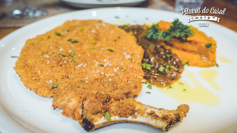 Bistecca di Maiale – Milanesa de bisteca suína com purê de abóbora e molho de cebola caramelizada