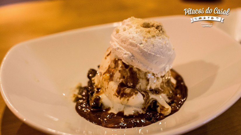 O brownie é com noz pecan e a raspa de chocolate foi substituída por crumble de biscoitos. É tudo sensacional. O brownie é molhadinho e bem doce, mas não enjoativo, e a calda de Havanna combinou perfeitamente com o sorvete de baunilha e o chantilly. Eu adoro uma farofinha, então o crumble por cima também veio para agregar no sabor.