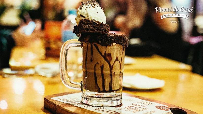 Para finalizar esse encontro de delícias, o Rock Thunder Shake juntou um milkshake de chocolate com creme de avelã, crumble de biscoito, o brownie do Chocolate Thunder from Down Under e chantilly. O brownie com chantilly vem equilibrado no topo da taça, mas fica um pouquinho difícil comê-lo sem fazer bagunça. Colocamos o brownie na tábua onde é servida a taça do milkshake, e partimos para a felicidade! Rsrs É uma sobremesa bem doce, mas bem gostosa.