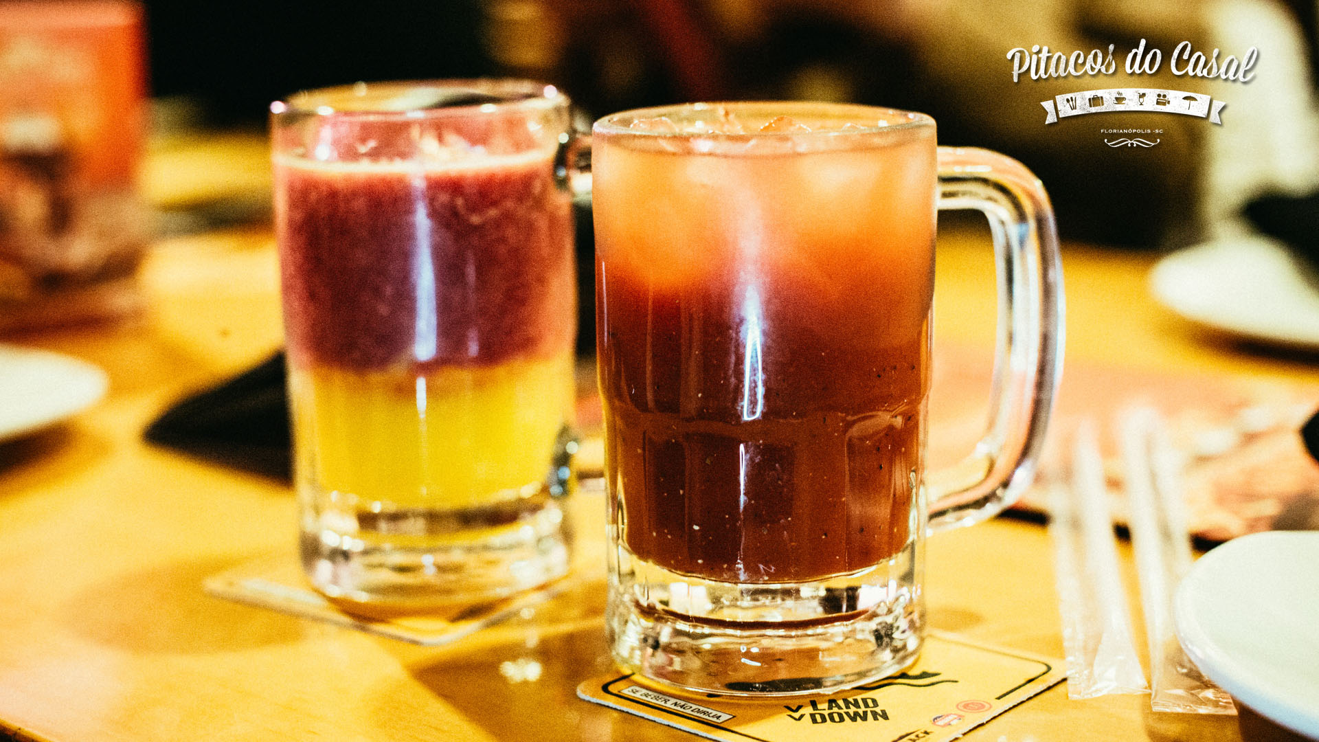 Para quem prefere um suco bem docinho, o Laramora é preparado com suco de morango e suco de laranja, e vem com as duas cores (vermelho e amarelo) separadas. A misturinha você mesmo faz na taça.