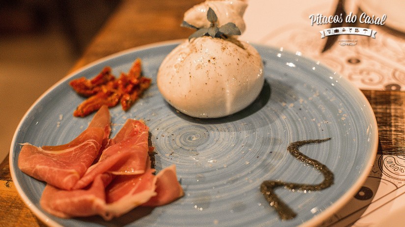 Começamos nossa noite com a Burrata Parma, que traz a burrata servida com tomate seco, presunto de parma, azeite extra virgem e molho pesto. É uma entrada refrescante, a burrata estava bem cremosa e compôs muito bem com os demais ingredientes, servidos separados no prato. Só achamos que faltou um pãozinho para acompanhar, mesmo assim pediríamos novamente.