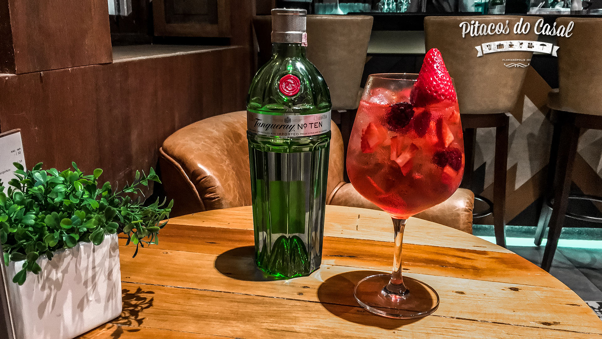 Tanqueray London Dry, suco de cramberry, água tônica e morangos