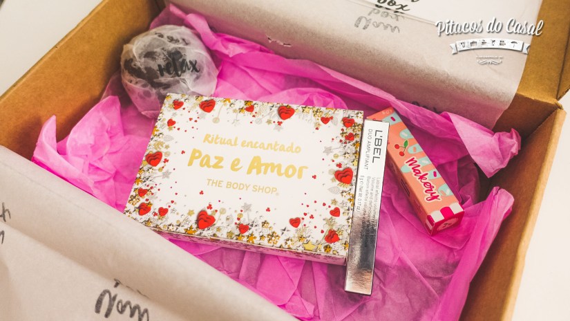 A minha caixinha de dezembro veio com um kit de sabonetes Ritual Encantado Paz e Amor da The Body Shop, um condicionador em barra da Relax Saboaria, um batom matte da Makery e um batom efeito volume e definição da L’Bel Brasil.