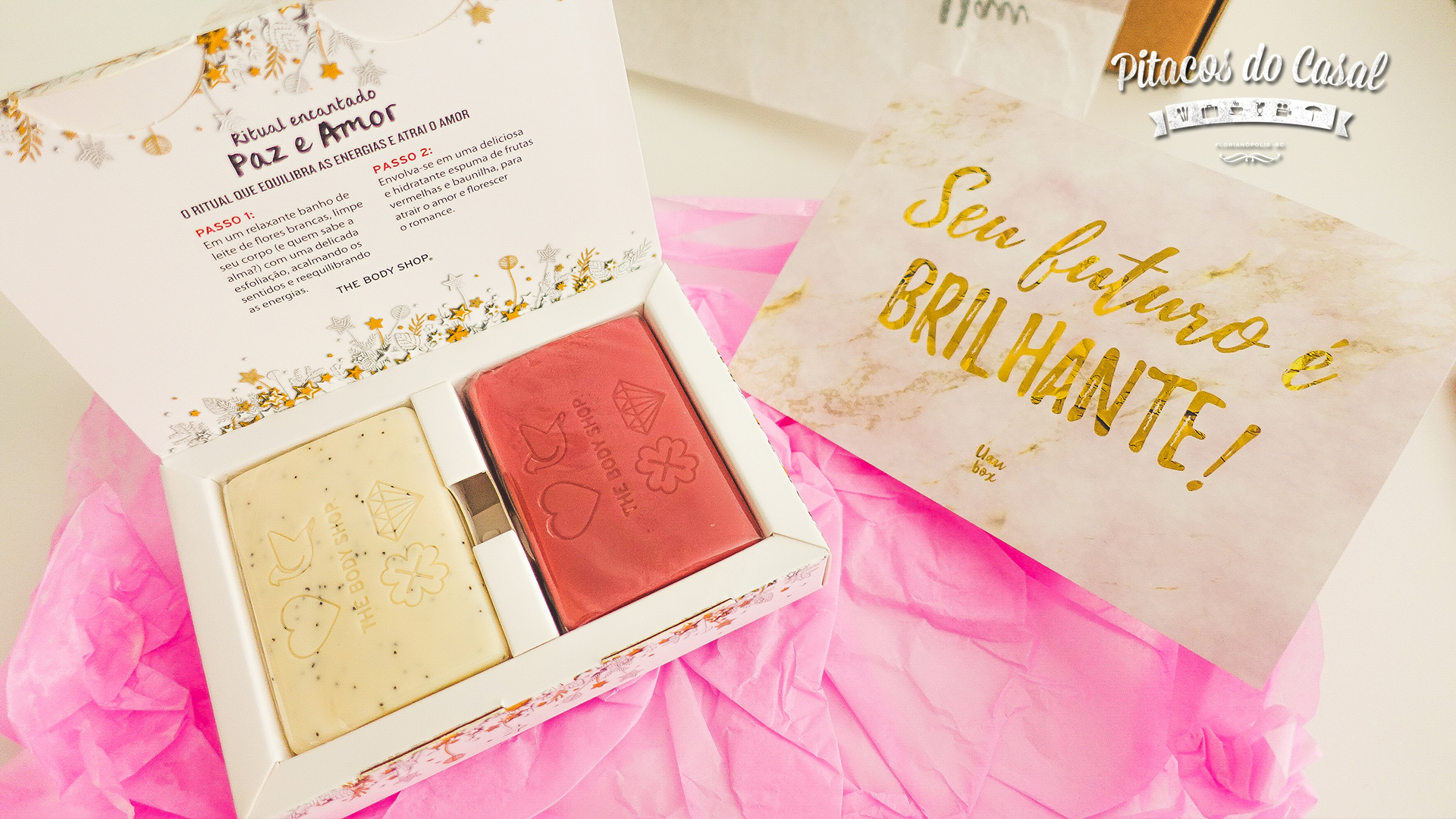 A minha caixinha de dezembro veio com um kit de sabonetes Ritual Encantado Paz e Amor da The Body Shop, um condicionador em barra da Relax Saboaria, um batom matte da Makery e um batom efeito volume e definição da L’Bel Brasil.