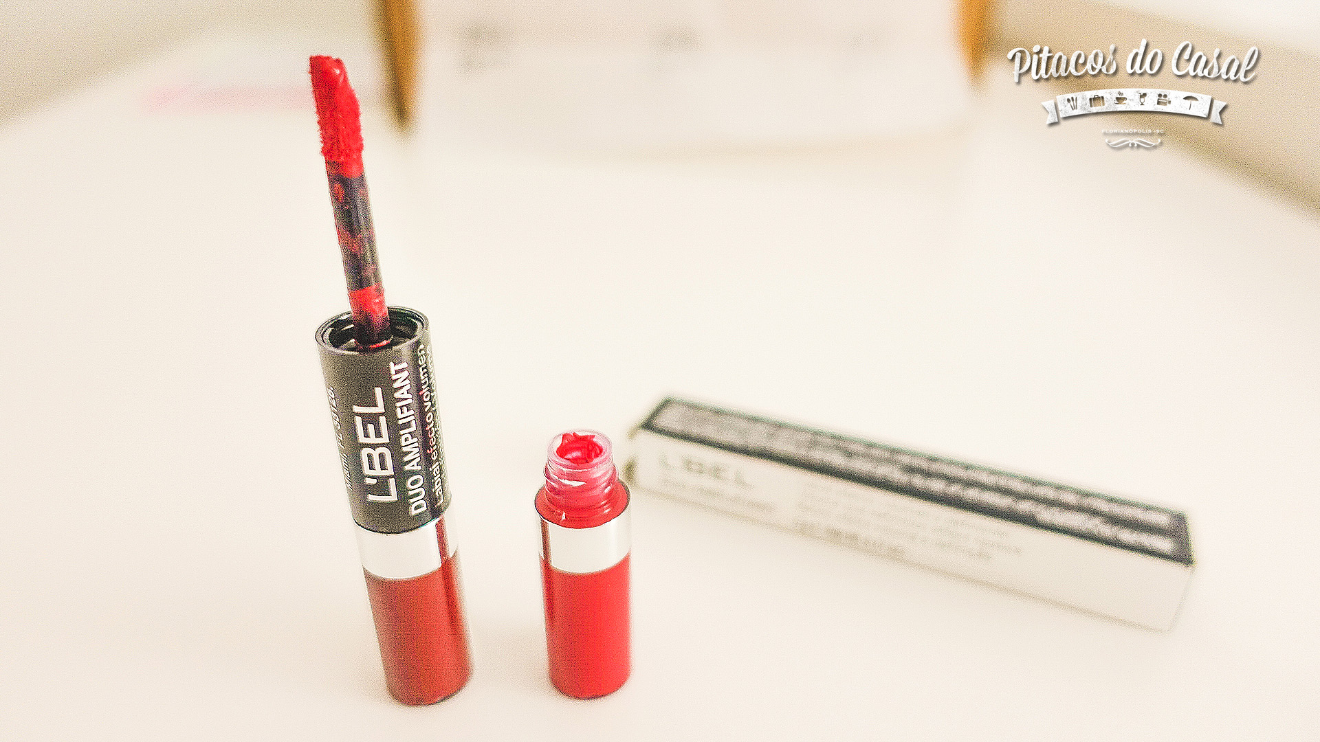 O batom da L’Bel tem efeito volume e definição. São duas cores de batom, um marrom e um vermelho. A parte escura vem com um pincel e o indicado é passá-lo no contorno dos lábios, para finalizar a boca com a cor mais clara pelo interior, e ficar, assim, com o efeito de volume. A cor (ou as cores) que recebi é linda, fiquei com um bocão bem poderoso.